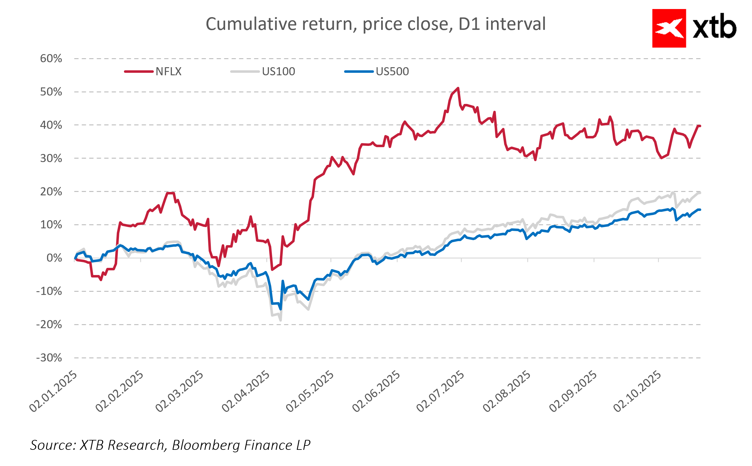 W 2025 roku Netflix wyróżnia się na rynku kapitałowym, osiągając wyniki zdecydowanie przewyższające główne indeksy, takie jak S&P 500 i Nasdaq 100. Takie wyniki kursu akcji pokazują, że inwestorzy mają duże zaufanie do strategii firmy oraz jej zdolności do generowania stabilnych i solidnych wyników finansowych. Netflix nie tylko przewyższa benchmarki, ale również cieszy się uznaniem analityków i inwestorów, którzy doceniają innowacyjność, rozwijanie oferty oraz efektywne zarządzanie kosztami. Ta mocna pozycja na rynku kapitałowym potwierdza, że Netflix jest atrakcyjną inwestycją długoterminową, łączącą potencjał wzrostu z finansową stabilnością.