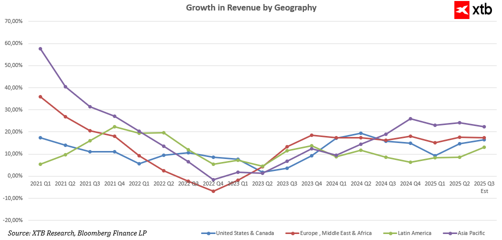 Europa, Bliski Wschód i Afryka (EMEA) to drugi co do wielkości rynek, rozwijający się pomimo wyzwań lokalnych. Przychody z tego regionu mają sięgnąć w tym samym okresie około 3,68 mld USD, napędzane ekspansją i dostosowaniem oferty do lokalnych potrzeb.