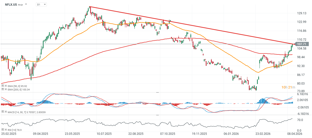 Z punktu widzenia rynku jest to więc raport wysokiego ryzyka. Netflix nie musi tylko pokazać wzrostu, ale udowodnić, że wzrost po podwyżkach cen pozostaje trwały, że reklama skaluje się zgodnie z oczekiwaniami i że spółka ma przestrzeń do poprawy całorocznych perspektyw. Jeśli te trzy elementy zostaną potwierdzone, spółka może utrzymać przewagę nad resztą sektora medialnego. Jeśli nie, wysoka baza oczekiwań może szybko obrócić się przeciwko kursowi. W praktyce ten raport będzie testem tego, czy Netflix nadal jest w stanie jednocześnie podnosić ceny, zwiększać bazę płacących użytkowników, rozwijać reklamę i utrzymywać wysoką rentowność. Przy obecnym poziomie wyceny i mocnym zachowaniu kursu inwestorzy nie oczekują już po prostu solidnego kwartału. Oczekują potwierdzenia, że spółka ma przestrzeń do dalszego wzrostu i że obecna premia w wycenie pozostaje uzasadniona.