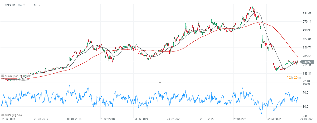 - Netflix zaskoczył pozytywną prognozą 4,5 miliona nowych subskrypcji do końca 2022 roku dzięki wersji serwisu z reklamami, na tym polu znów wyprzedził szacunki Wall Street, które wg. Reutersa wynosiły 4,2 miliona. Firma spodziewa się jednak spadku przychodów w IV kw. do 7,8 mld USD z powodu wciąż silnego amerykańskiego dolara, który ciąży firmie. Netflix planuje premiery 'The Crown' oraz 'Knives Out' w IV kwartale roku, co może okazać się pozytywny dla spółki zwłaszcza w obliczu okresu jesienno-zimowego, który może napędzać oglądalnosć;
