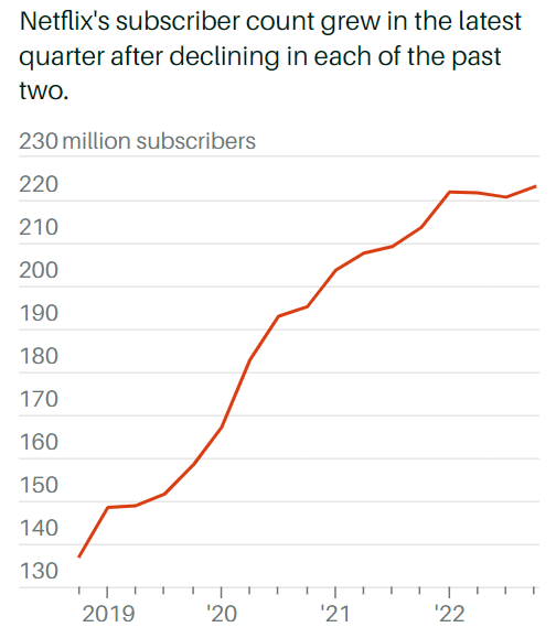 - Od lipca do września Netflix dodał 2,4 mln nowych subskrypcji. W pierwszych dwóch kwartałach roku stracił ok. 1,2 mln w obliczu rosnącej konkurencji m.in. ze strony Paramount+ i Disney+. Obecnie Netflix posiada 223,1 mln subskrypcji na całym świecie, a jego roczny bilans subkrypcji wyszedł na plus już w III kwartale roku. Akcje są wciąż notowane blisko 60% poniżej szczytów z 2021;