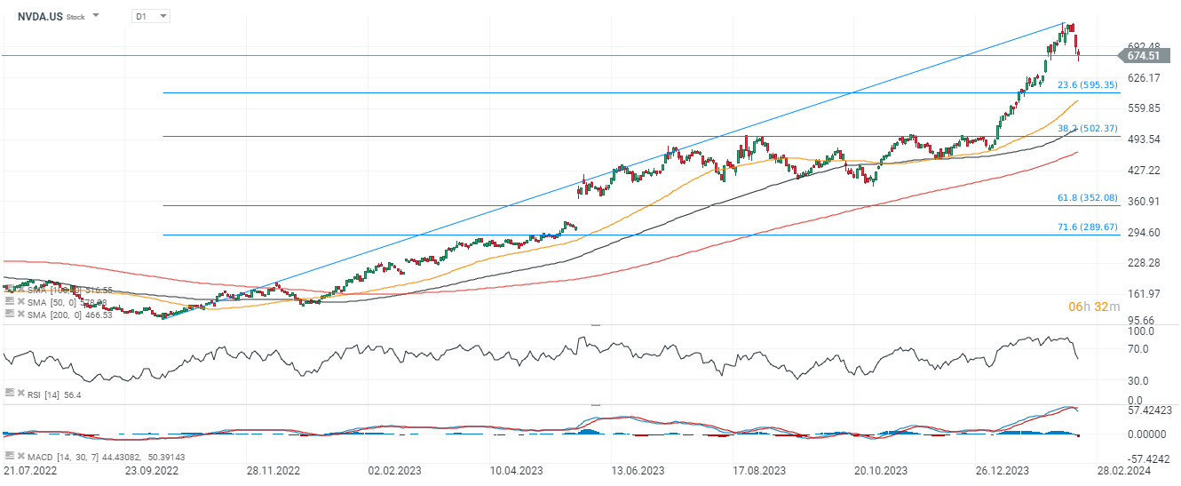 Raport okazał się bardzo mocny, sygnalizując ogromną dynamikę inwestycji w AI i popyt na chipy AI (centra danych). Inwestorzy mają kolejny "twardy dowód" na to, że popyt na sztuczną inteligencję jest realny, a rewolucja może nie być nawet bliska rozpoczęcia. Warto jednak zauważyć, że firma ma już ogromną kapitalizację rynkową (ponad 1,6 bln USD) i trudno oczekiwać, aby akcje rosły o 100% w każdym kolejnym roku. Wybitny 2023 rok był przełomowy dla całego biznesu Nvidii, ale jeśli inwestorzy będą zbyt optymistyczni w prognozach na kolejne kwartały, to wciąż miejsca na rozczarowanie jest sporo.