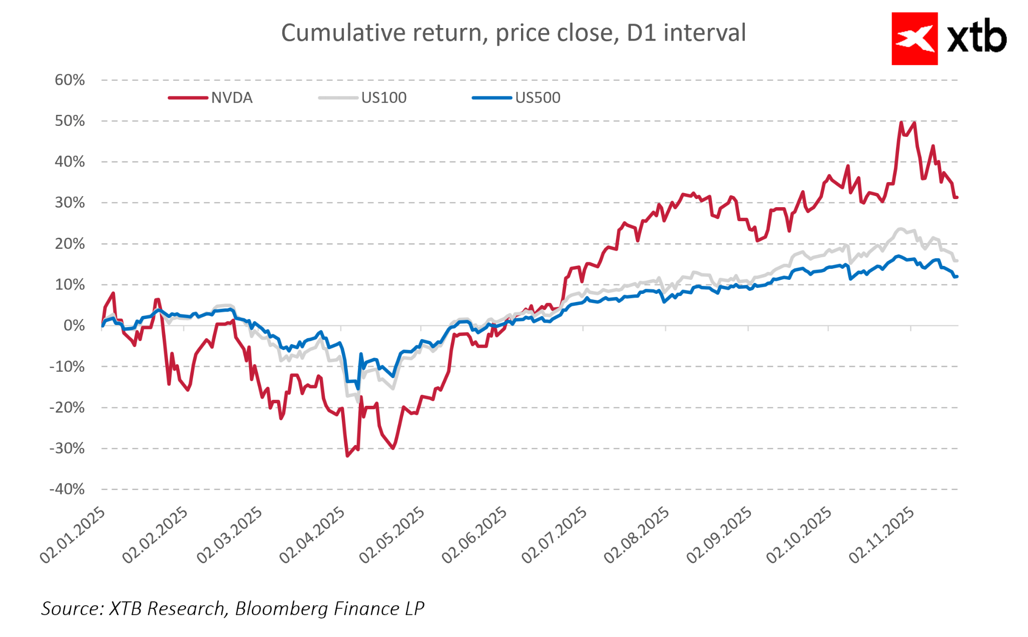 Z kolei jeśli wyniki Nvidii okażą się niższe od oczekiwań –czy to w zakresie przychodów, zysków, czy marż, rynek może to odebrać jako sygnał ostrzegawczy. W takim wypadku pojawi się obawa, że boom AI, który napędzał rynki technologiczne i półprzewodnikowe w ostatnich kwartałach, może zacząć tracić impet.