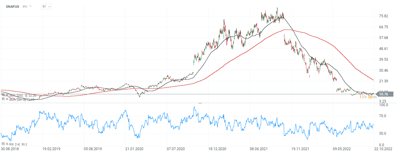 Wykres akcji Snap (SNAP.US), interwał D1. Wyprzedaż akcji jest bezprecedensowa, a otwarcie wskazuje na poziom w okolicach 8 USD za walor. Wydaje się jednak, że paniczna reakcja wokół sektora reklamy moze stanowić okazję dla inwestorów o długim horyzoncie inwestycyjnym, choć sam Snap będzie musiał skoncentrować się na monetyzacji swojej działalności. Optymistycznie wygląda jednak rosnąca ilość globalnych użytkowników, a same przychody rozminęły się z oczekiwaniami o zaledwie 10 mln USD. Inwestorzy obawiają się rosnącego dla Snapa poziomu zadłużenia, który już w II kw. kwartale wzrósł o 46% w ujęciu rocznym i wskazał 3,773 mld USD. Po dzisiejszym otwarciu poziom długoterminowego zadłużenia odpowiadał będzie mniej więcej 25% całkowitej rynkowej kapitalizacji firmy. Źródło: xStation5