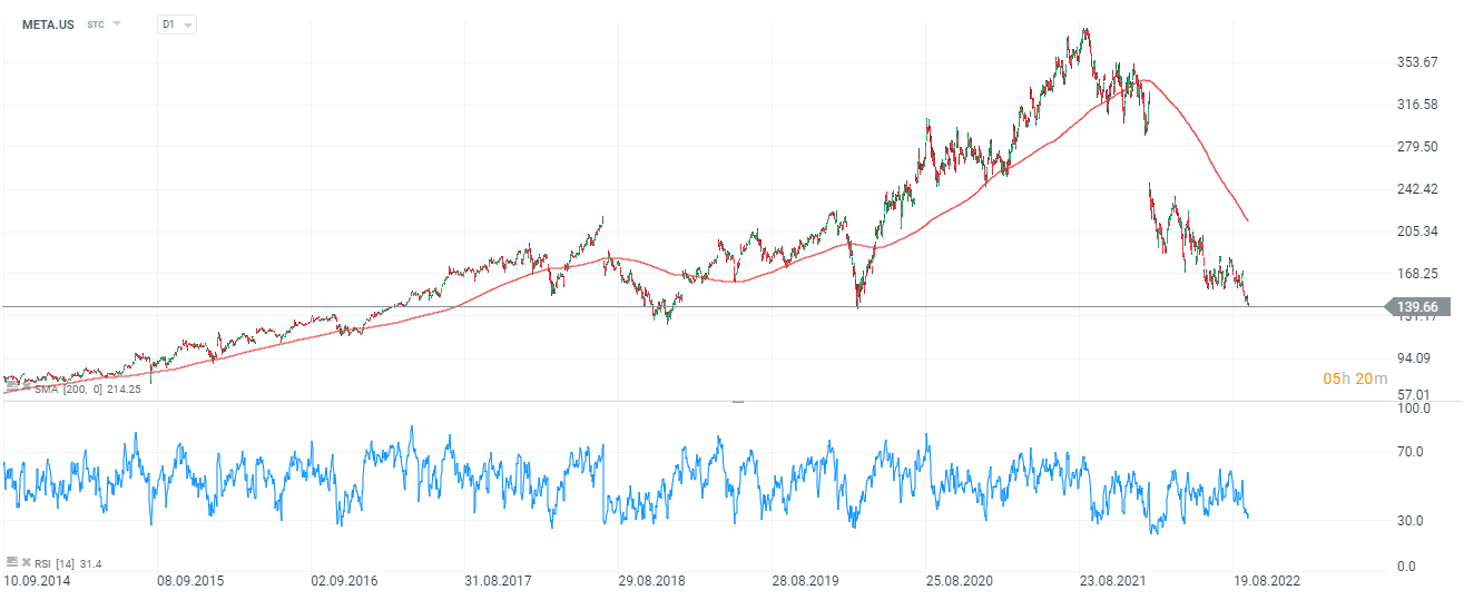 Akcje Meta Platforms (META.US), interwał D1. Spółka kontynuuje spadkowy trend, cena akcji znajduje się na poziomach wyprzedaży z marca 2020 roku i blisko minimów z 2018 roku, co może zwiastować nadchodzące odreagowanie. RSI w okolicach 31 punktów znajduje się w okolicach, które w przeszłości okazywały się być odpowiednim miejscem do zakupu. Coraz lepiej wygląda wycena od strony fundamentalnej, wskaźnik C/Z zbliżył się do okolic 11 punktów co daje wynik dwukrotnie niższy od średniej dla spółek indeksu NASDAQ. Lepiej wyglada też wskaźnik ceny do wartości księgowej, która wynosi niewiele powyżej 3, wobec 4,9 średniej. Z drugiej strony biznes Meta Platforms nigdy nie zmagał się z tak znacznymi problemami i osłabieniem przychodów. Wysokie stopy procentowe i wizja spowolnienia gospodarczego mogą jednak obniżyć stawianą przez analityków dla notowań Meta Platforms. Jeśli firma pokaże, żę będzie w stanie sprostać wyzwaniom w nowych okolicznościach makroekonomicznych, obecna wycena może okazać się atrakcyjna dla kontrariańskich inwestorów. Źródło: xStation5