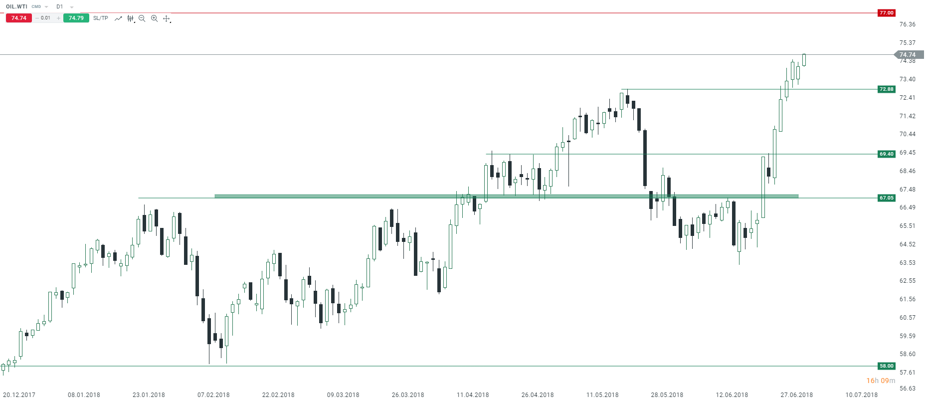 Ropa WTI zyskuje dzisiejszego dnia i już znajduje się na najwyższym poziomie od kilku lat zmierzając w okolice ważnej strefy 75-77 USD za baryłkę. Źródło: xStation5