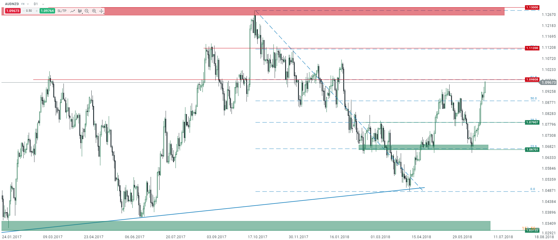 AUDNZD dociera do ważnego poziomu oporu. Jego pokonanie mogłoby doprowadzić do kontynuacji fali wzrostowej w okolice poziomu 1,1120. Źródło: xStation5