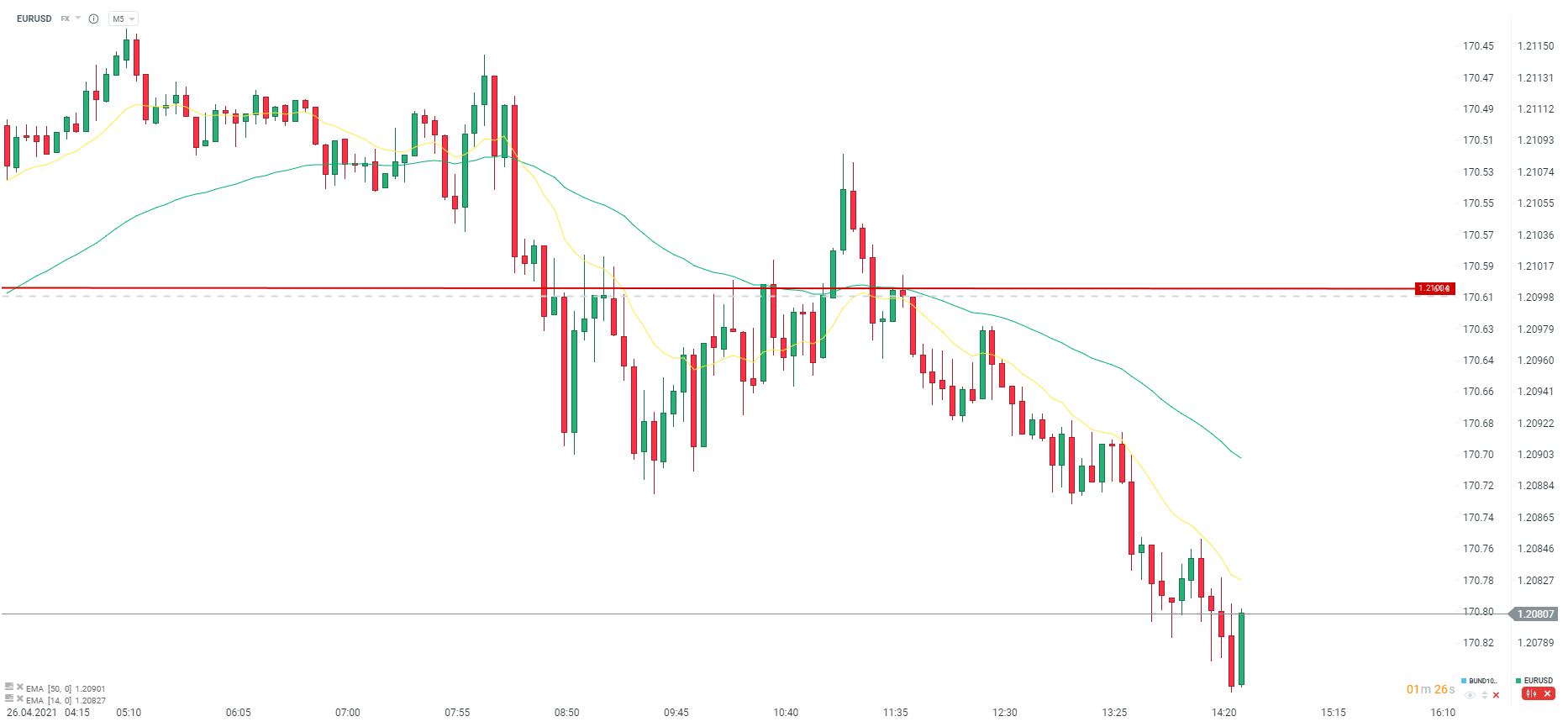 EURUSD tracił już od wczesnego popołudnia, spadając kolejny raz poniżej poziomu 1,2100. Aktualnie po lekkim rozczarowaniu danymi obserwujemy próbę odbicia. Na interwale M5 mamy strefę podażową w postaci dwóch średnich ruchomych. W przypadku powrotu do spadków wsparcie to 1,2070 oraz 1,2050.