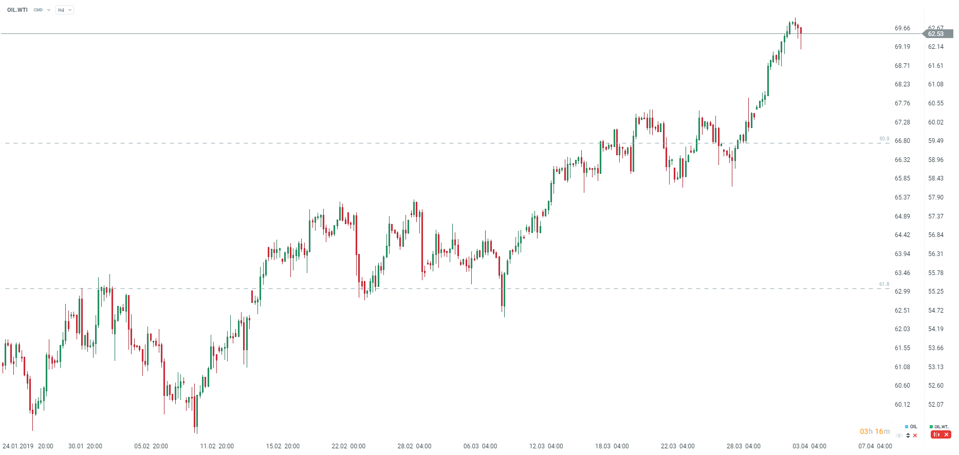 Ropa reaguje lekkimi spadkami po publikacji raportu DOE, ale widać, że popyt próbuje przywrócić cenę na poprzedni tor. Kolejny opór znajduje się przy 64,00 USD za baryłkę, natomiast wsparcie zlokalizowane jest przy poziomie 60,00 USD za baryłkę. Źródło: xStation5