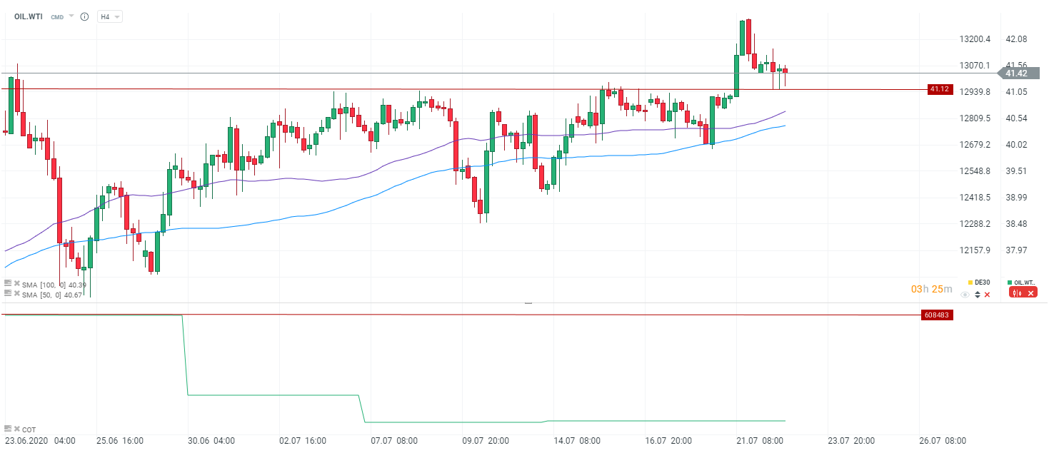 Ropa w zasadzie nie reaguje na dane, choć widać, że ropa znajduje się pod presją. Jednocześnie jednak okolice poziomu 41 USD za baryłkę stanowią obecnie wsparcie dla ropy. Poniżej kolejne wsparcie w okolicach poziomu 40,50 gdzie znajdują się dwie średnie ruchome. Źródło: xStation5