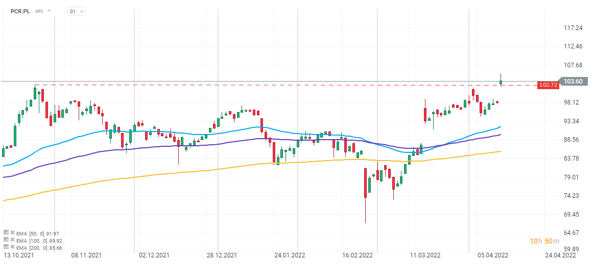 Walory spółki PCC Rokita (PCR.PL) rozpoczęły dzisiejsze notowania od dużej, byczej luki cenowej, która zasięgiem wybiła szczyty z października 2021 roku. Poziomy te stanowią teraz wsparcie cenowe dla notowań akcji spółki. Zejście poniżej tego poziomu oraz dopełnienie luki wzrostowej mogłoby zanegować krótkoterminowy zryw strony popytu. Źródło: xStation 5
