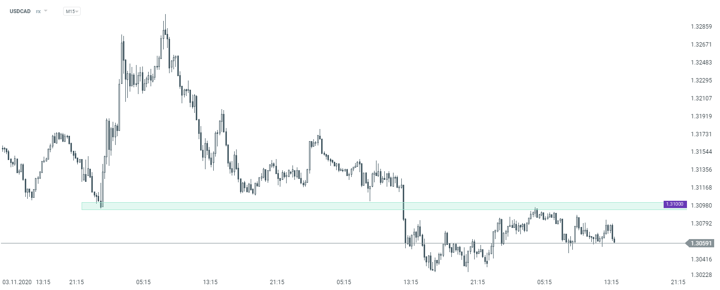 Podczas gdy inwestorzy głównie skupiają się na danych z rynku pracy w USA, o tej samej porze poznaliśmy odczyty z Kanady. Zatrudnienie w październiku wzrosło jedynie o 83,6 tys. podczas gdy spodziewano się wyniku na poziomie 100 tys. (poprzednio 378 tys.). Z kolei stopa bezrobocia spadła z 9,0% do 8,9%, podczas gdy oczekiwano spadku do 8,8%. Na dolarze kanadyjskim nie widać jednak większej reakcji. Patrząc na parę walutową USDCAD, kluczowym oporem intraday pozostaje strefa przy 1,3100.