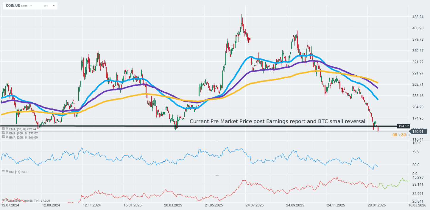 Akcje Coinbase (COIN.US) zyskują 9% tuż przed otwarciem sesji kasowej w USA, mimo słabszych od oczekiwań wyników za IV kwartał 2025. Inwestorzy zignorowali niższe od oczekiwań przychody i skupili się na optymizmie zarządu co do szybkiego uchwalenia ustawy regulującej rynek kryptowalut (Clarity Act), która ma przynieść branży większą jasność prawną oraz samego niewielkiego odbicia cen BTC wobec ostatniej fali wyprzedaży. Co ciekawe, akcje są jednak nadal notowane około 50% niżej niż przed rokiem.