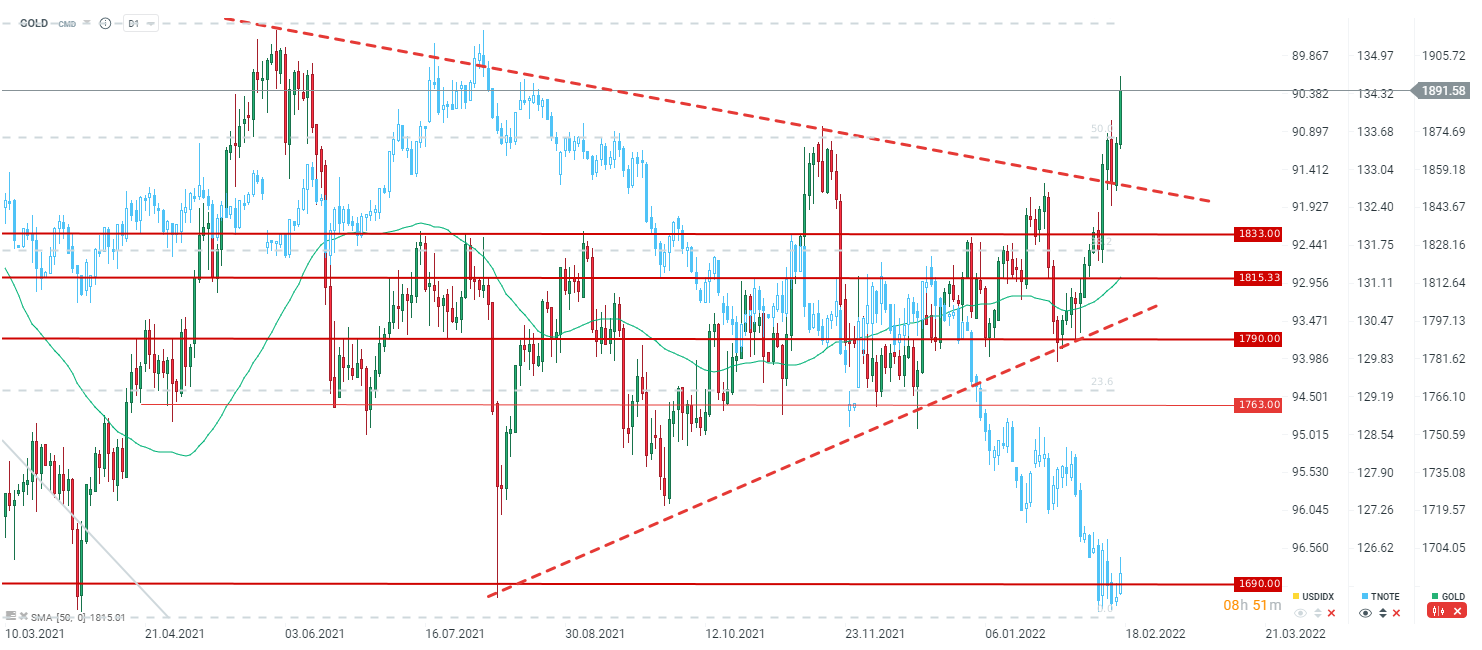 Złoto wybija się z chwilowej konsolidacji przy 1875 i testuje niemal okolice 1900 USD. Źródło: xStation5