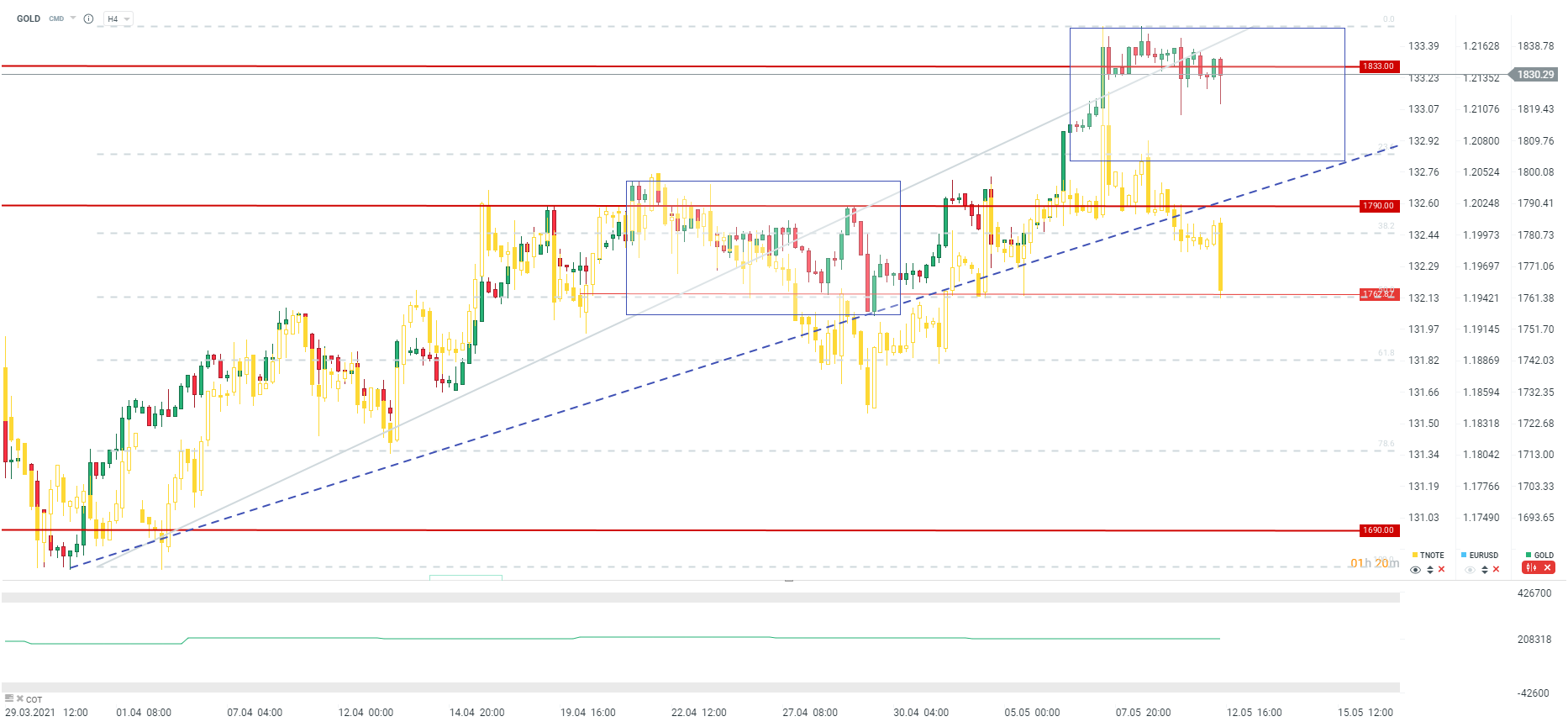 Poniżej przedstawiamy zapis video z naszej konferencji na którym więcej na temat tego, czy zależność inflacji oraz złota istnieje. Tymczasem przy odczycie inflacyjnym na poziomie 4,2% r/r oraz bazowej 3,0% r/r (oczywiście w dużej mierze ze względu na niski efekt bazy z zeszłego roku) obserwujemy spore ruchy na rynku. Złoto próbuje wybić się dołem z ostatniej konsolidacji, choć poziom 1820 stanowi spore wsparice. Z drugiej strony wyraźne spadki na TNOTE, które teoretycznie mogą pociągnąć złoto. Wyższa inflacja to wyższe rentowności, które są negatywne dla złota. Wobec czego w tym wypadku zależność TNOTE złoto powinna być silniejsza niż w przypadku złota oraz inflacji.