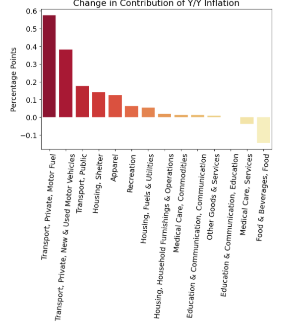 Spory wpływ cen paliw, ale również samochodów. Póki co efekt rynku nieruchomości pozostaje ograniczony. Źródło: Macrobond, XTB