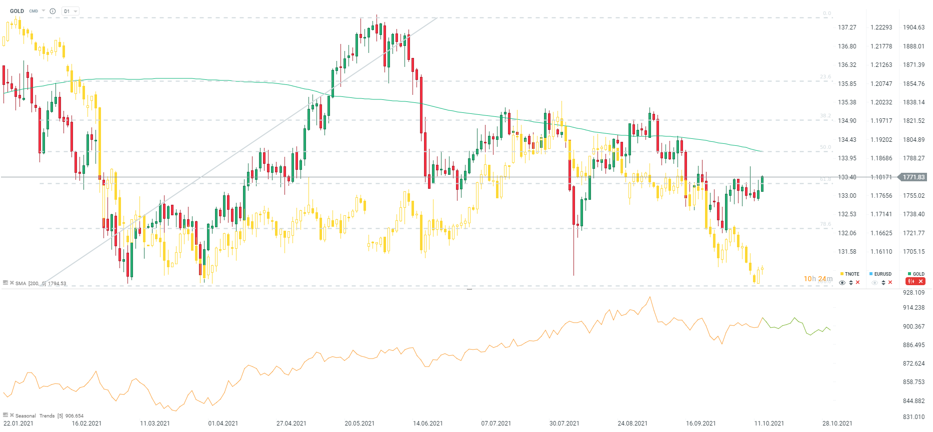 Złoto kolejny raz zawitało w okolicach górnej granicy krótkoterminowej konsolidacji, nieco powyżej poziomu 1770 dolarów za uncję. W przypadku kontynuacji wzrostowego impetu, kolejne opory to dopiero okolice 1790 dolarów za uncje. Złoto jest w ostatnim czasie bardzo wrażliwe na perspektywy zmiany polityki monetarnej w Stanach Zjednoczonych. Ostatnie posiedzenie Fed wskazało, że można oczekiwać rozpoczęcia taperingu programu QE w tym roku, jeśli dojdzie do znacznego progresu w gospodarce. Dane z rynku pracy za wrzesień nie były zadowalające, co stawia znak zapytania przy dalszych działaniach Fed. Niemniej wyraźna determinacja ze strony członków Fed w dzisiejszych minutes o godzinie 20:00 może ponowić obawy o zmianę w kierunku polityki Fed.