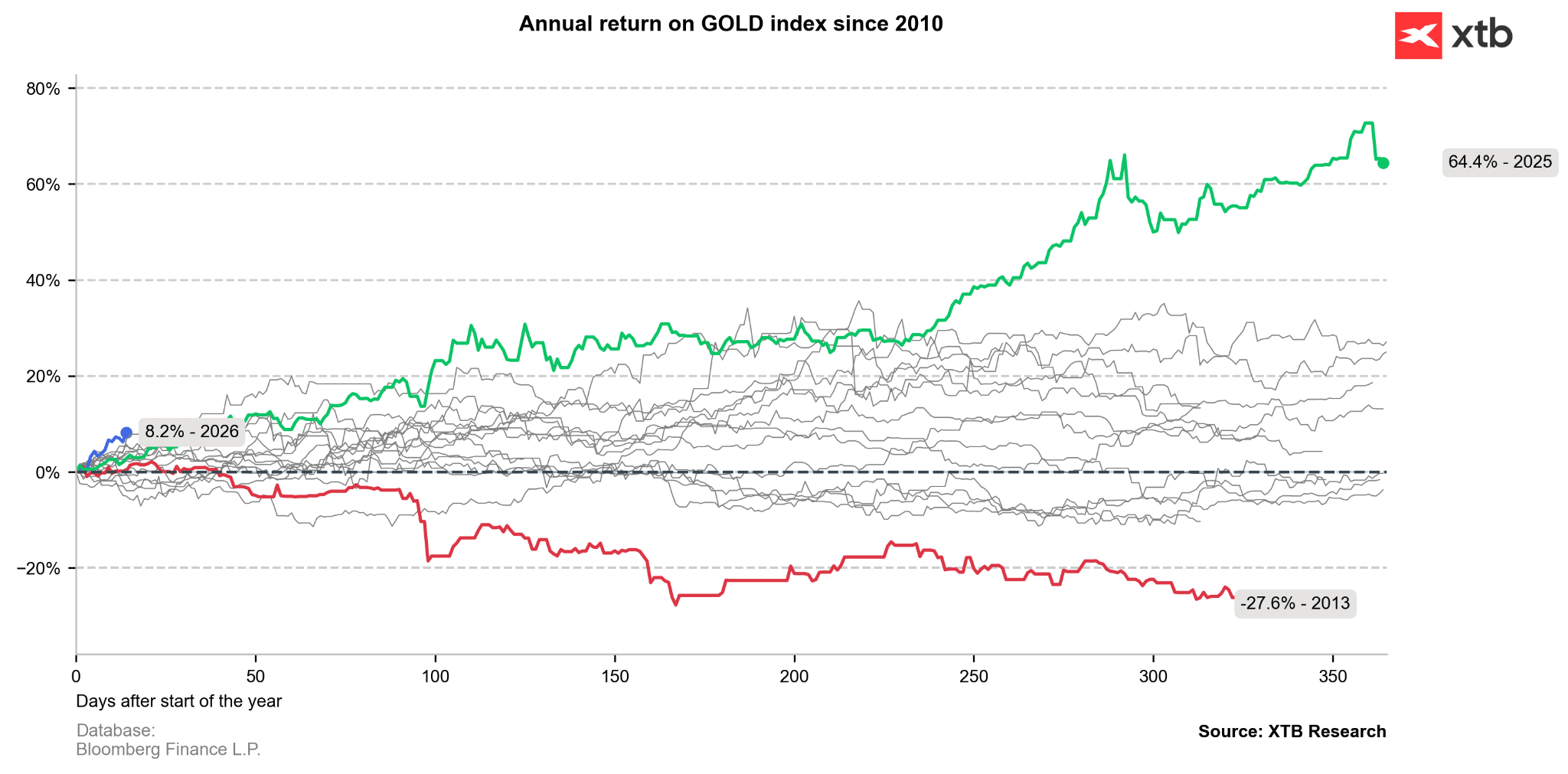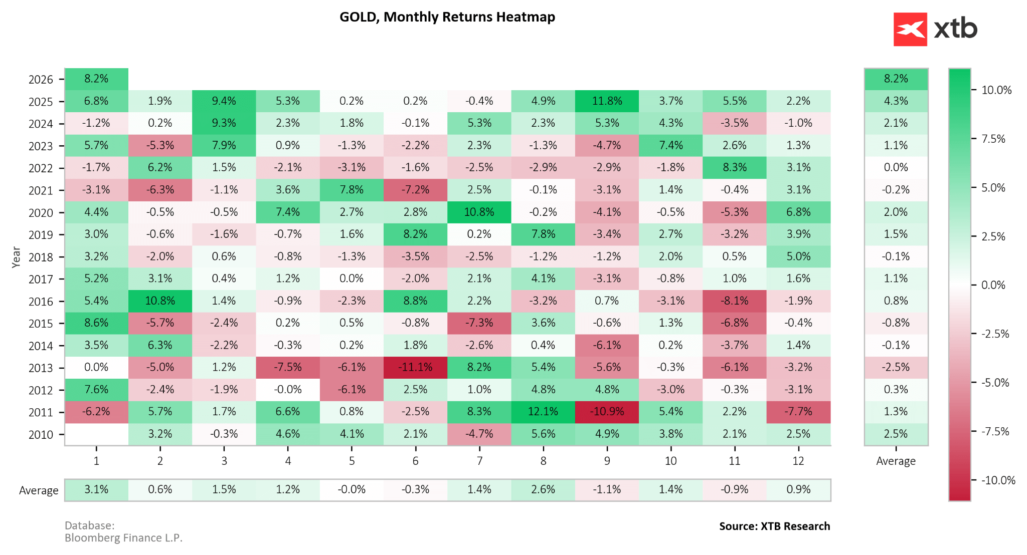 Początek roku, a w szczególności styczeń, historycznie sprzyja złotu pod względem sezonowości. Obecne wzrosty cen są dodatkowo wzmacniane przez napiętą sytuację geopolityczną.