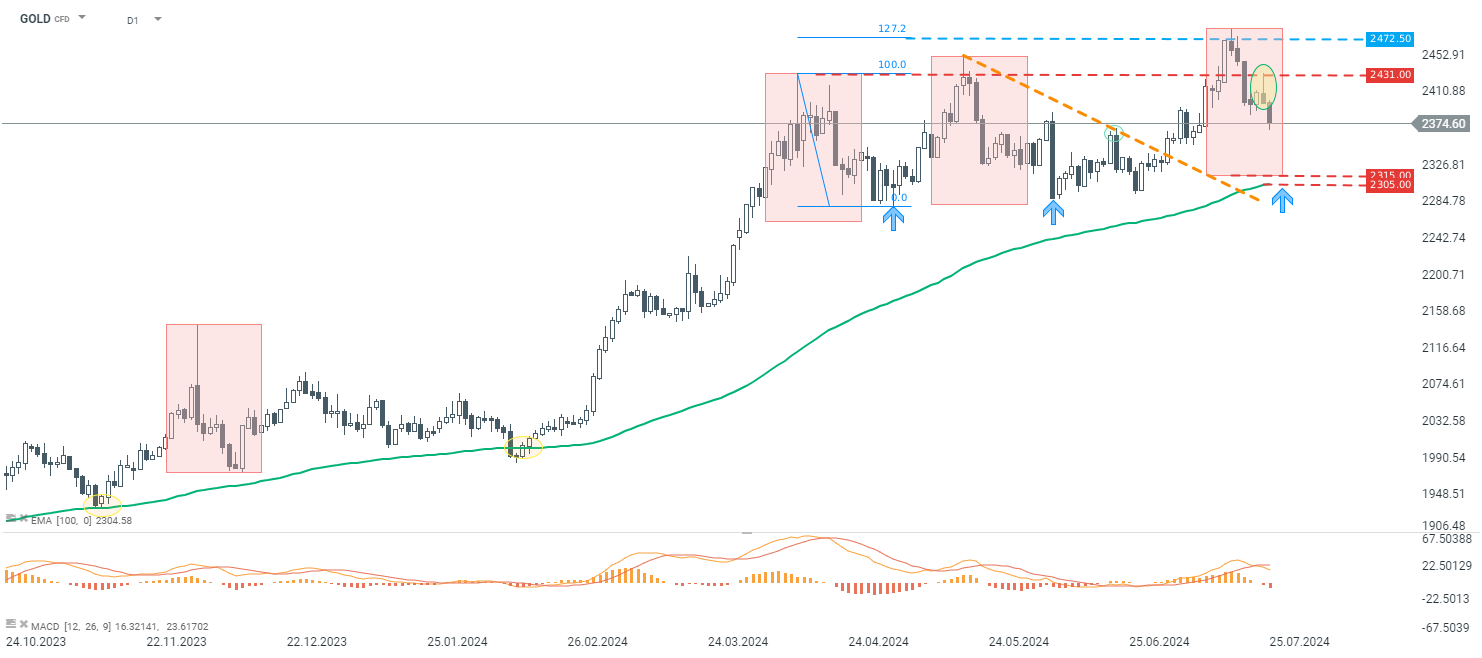 Podczas wczorajszej sesji obserwowaliśmy próbę przerwania spadków na złocie. W trakcie dnia notowania GOLD ruszyły wyraźnie w górę, jednak nie zdołały przekroczyć poziomu oporu przy 2431$, po czym ostatecznie dzień zamknął się na minusie. Dodatkowo na interwale D1 utworzyła się pro spadkowa formacja spadającej gwiazdy, a dziś przecena jest kontynuowana. Aktualnie istnieje więc ryzyko rozszerzenia spadków w kierunku strefy wsparcia 2315 - 2305$. Miejsce to wynika z dolnego ograniczenia szerokiego układu 1:1 oraz średniej EMA100.