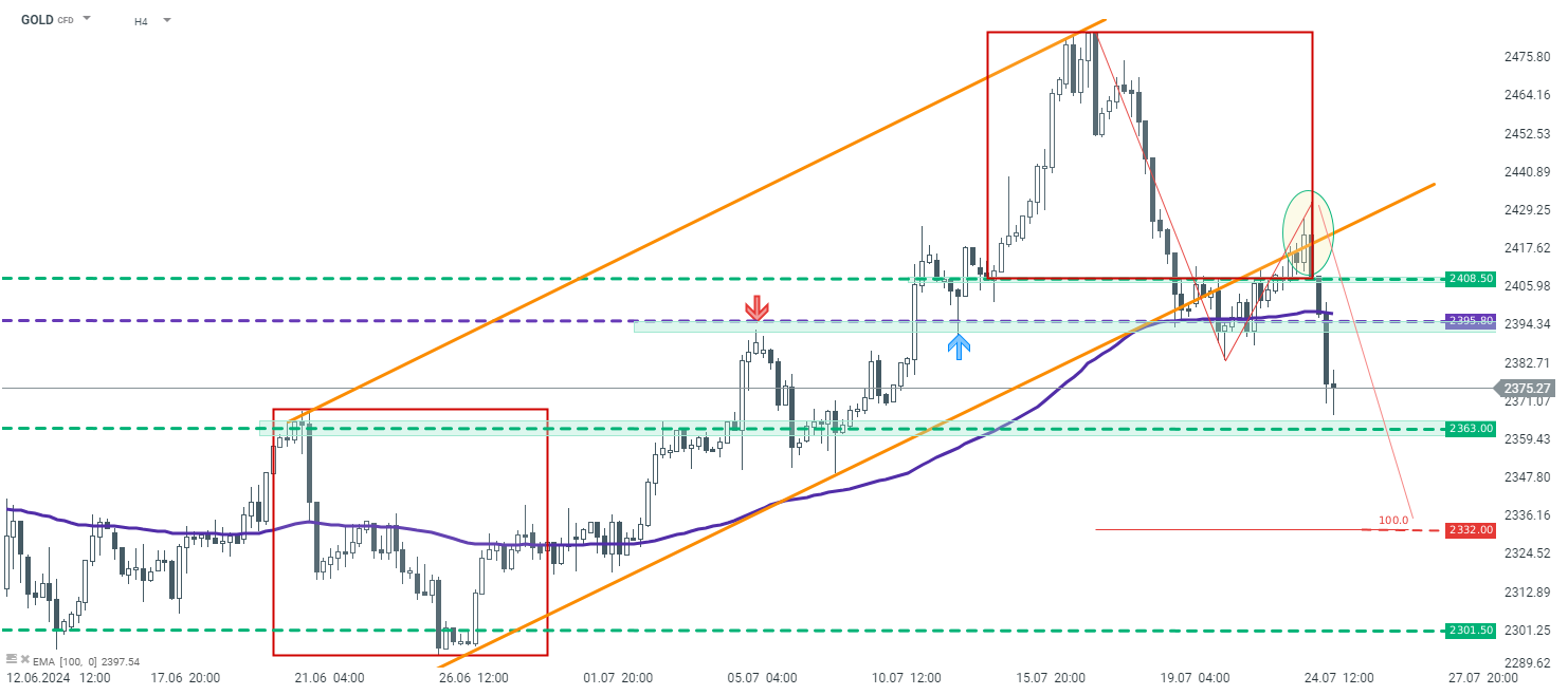 Patrząc na niższy interwał czasowy - H4, cena nie zdołała wrócić do wewnątrz kanału wzrostowego co poskutkowało wygenerowaniem kolejnej fali spadkowej. Notowania złamały także wsparcie przy poziomie 2395$, wynikające z wcześniejszych reakcji cenowych i średniej kroczącej, co otwiera drogę do dalszych spadków. Aktualnie cena zbliża się do wsparcia przy 2363$, gdzie mogą się pojawić kupujący. W przypadku jego zanegowania, kolejny ważny poziom to 2332$, gdzie znajduje się geometria FE100 - wyznaczająca równość 1:1 na potencjalnej korekcie prostej ACB.