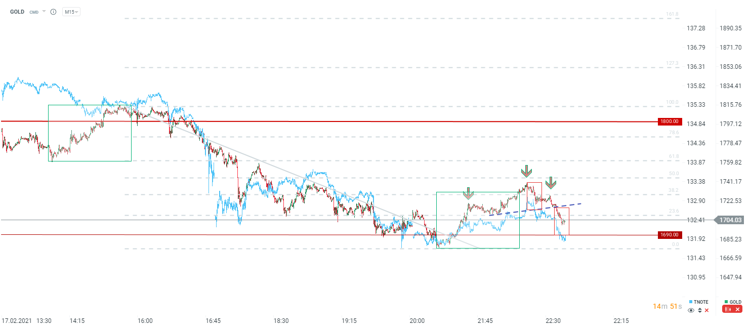 Cena złota przymierza się ponownie do testu poziomu 1700 dolarów za uncję. Powrót złota do spadków to efekt rosnących rentowności w Stanach Zjednoczonych. Jak widać podpisanie ustawy o wsparciu dla gospodarki przez Joe Bidena nie wywołuje spadku rentowności, a wręcz odwrotnie, co może być powiązane z oczekiwaniami inflacyjnymi. Rentowności 10 letnich obligacji powracają powyżej 1,6%. Co więcej, efekt wczorajszej zapowiedzi EBC o wzroście tempa skupu aktywów w ramach programu QE nie odniósł zamierzonych skutków. Dzisiaj można usłyszeć od bankierów EBC, że zwiększenie tempa będzie przejściowe, co może nieco osłabiać oczekiwania inwestorów.