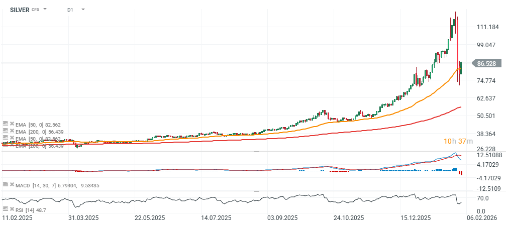 Podobnie srebro, które ma za sobą spadek poniżej EMA50 (podobny skalą do tego z marca 2025 - również odbija, choć RSI nie zdołało wzrosnąć jeszcze powyżej 50 po ostatnim, drastycznym spadku.