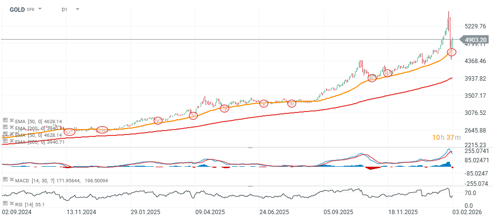 Złoto szybko odbiło po spadku poniżej EMA50 na interwale dziennym. Widzimy, że od początku 2025 roku, poziom EMA50 okazywał się wielokrotnie silnym wsparciem trendu.
