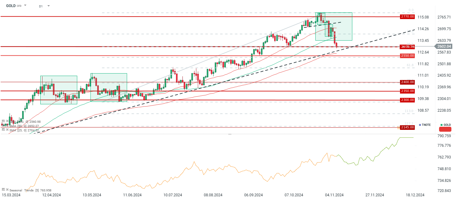 Złoto zalicza obecnie największą korektę w tym roku, która sięga już ok. 200 USD na jednej uncji. Obecnie testowany jest poziom 2600 USD za uncję, który zbiega się ze zniesieniem 38.2 ostatniej dużej fali wzrostowej. Kolejne ważne wsparcie znajduje się przy poziomie 2550, który zbiega się ze zniesieniem 50%. Pomiędzy poziomami 2550 oraz 2600 znajduje się linia trendu wzrostowego z bieżącego roku oraz średnia 100 okresowa. Sezonowość wskazuje, że na przełomie listopada oraz grudnia powinniśmy oczekiwać ożywienia.