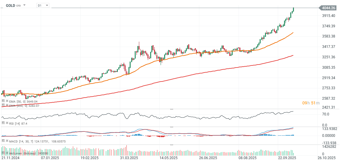 Złoto przekroczyło 4000 USD za uncję i kontynuuje hossę w kierunku 4050 USD. Wskaźnik RSI na dziennym interwale zbliża się do okolic 90, sygnalizując wykupienie, a dystans między ceną a 50-sesyjną średnią kroczącą EMA50 (pomarańczowa linia) powiększa się. Średnia przebiega obecnie przy 3650 USD ok. 10% poniżej dzisiejszych, lokalnych szczytów. Patrząc na wolumen, widzimy od 4 dni przeważający wolumen zakupowy. Rynek prognostyczny Kalshi szacuje, że zamknięcie rządu potrwa około 22 dni, co oznaczałoby, że rząd w USA zostanie otwarty dopiero ok. 22 października. To sprawia, że Fed nie otrzyma w tym czasie najnowszych danych makro m.in. danych NFP czy inflacji CPI za wrzesień. Spowolnienie rynku pracy, na które wskazują praktycznie wszystkie wskaźniki, także te spoza BLS sprawia, że Fed niemal na pewno podejmie jutro decyzję o obniżce stóp procentowych.