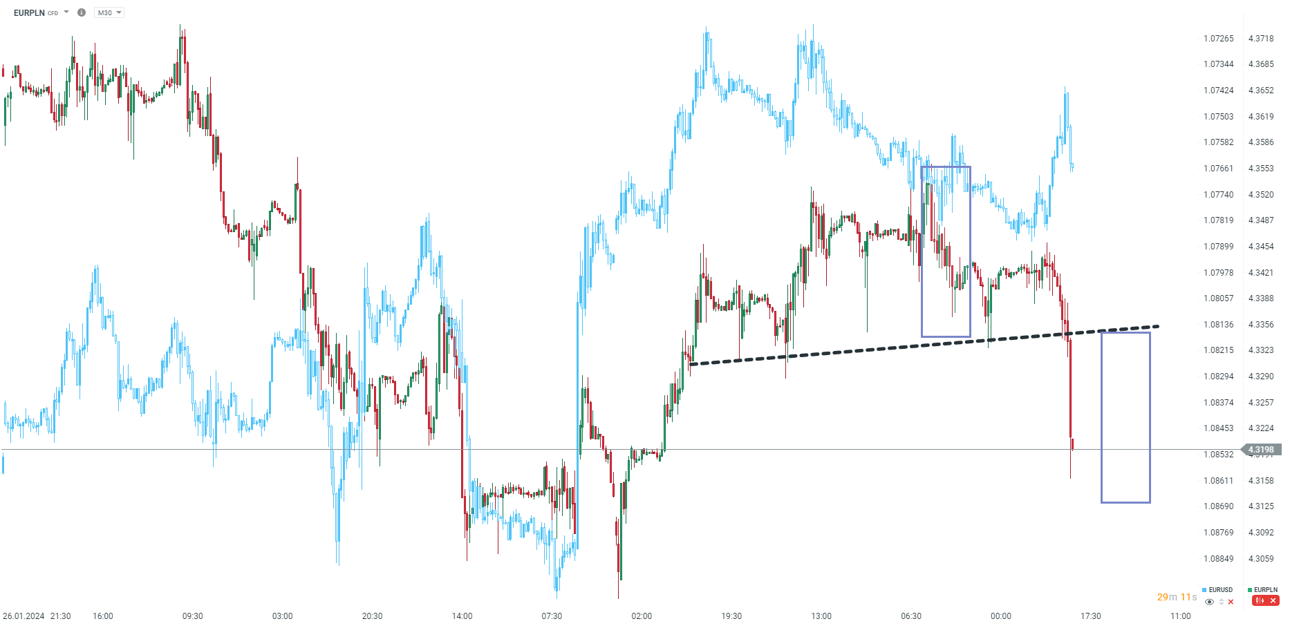 Para EURPLN jest wyraźnie niżej i dochodzi do niemal pełnej realizacji formacji RGR na parze. Para znajduje się blisko lokalnych dołków z 5 lutego.
