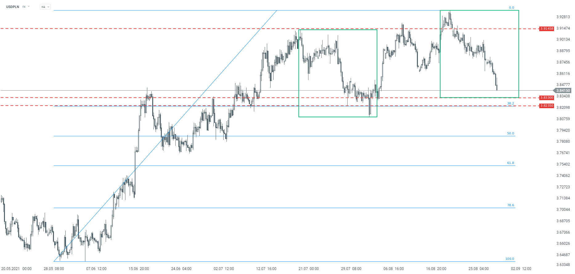 Patrząc technicznie na wykres USDPLN, notowania kontynuują ruch w ramach korekty spadkowej. Jeżeli obecny sentyment nie ulegnie zmianie, możliwy jest atak na strefę wsparcia 3,8330 - 3,8235, która wynika z dolnego ograniczenia lokalnego układu 1:1, jak mierzenia 382% FIbonacciego, a także wcześniejszych reakcji cenowych.