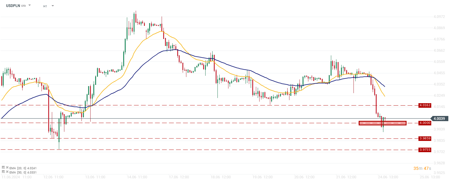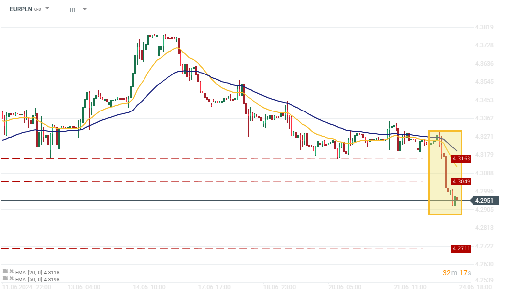 Tendencje aprecjacyjne widać także na wykresie EURPLN. Przebicie dolnego ograniczenia trendu bocznego z zeszłego tygodnia umacnia trwające od szczytów z 14.06 tendencje podażowe. Dziś notowania spadły poniżej wsparcia na poziomie 4,3049 i wahają się w granicy 4,2951-4,3000. Na wykresie widzimy powstającą formację flagi w trendzie spadkowym, co teoretycznie w przypadku przebicia ograniczeń formacji, może powodować kolejną presję spadkową.