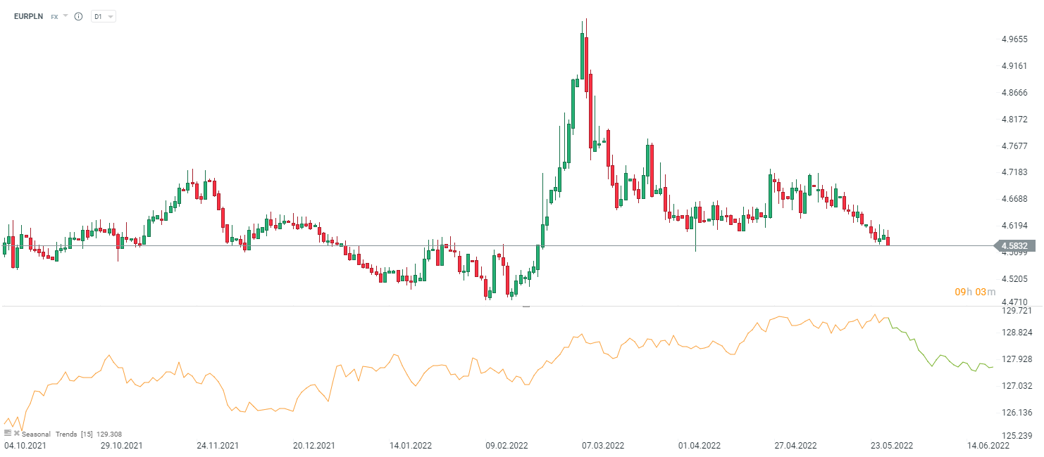 EURPLN przebija się wyraźnie poniżej 4,60 i notowany jest w tych okolicach w których notowany był przed rozpoczęciem wojny w Ukrainie. Źródło: xStation5