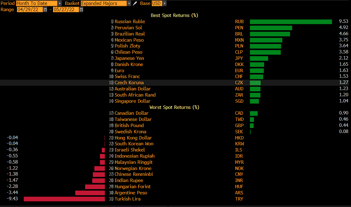 Złoty jest zdecydowanie najmocniejszą europejską walutą w tym miesiącu. Złoty wyraźnie zyskuje w ostatnich dniach w szczególności, co jest powiązane z prawdopodobnym końcem sporu w sprawie środków z Krajowego Planu Odbudowy. W czwartek sejm uchwalił nowelizację ustawy o Sądzie Najwyższym, co prawdopodobnie może odblokowac unijne środki. Premier Morawiecki zapowiedział, że początkiem czerwca w Polsce pojawi się szefowa KE, Ursula von der Leyen, co może być wykorzystane do ogłoszenia tego wydarzenia. Teoretycznie środki mogą zacząć płynąć do Polski już w sierpniu. Oczywiście nadzieje na wypłatę środków wyraził polski rząd, ale potencjalne uruchomienie środków nie zostało jeszcze potwierdzone przez stronę europejską.