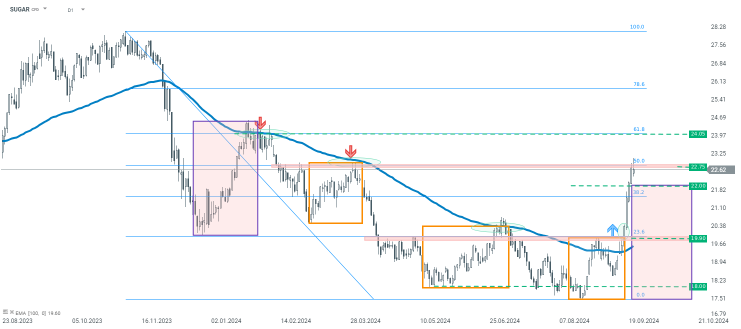 W ostatnim czasie zwracaliśmy uwagę na ciekawą sytuację na rynku cukru (SUGAR). Mianowicie, patrząc na wykres D1, notowania zdołały 17 września przebić się powyżej oporu wynikającego z górnego ograniczenia układu 1:1, zaznaczonego pomarańczowym prostokątem. Za wybiciem w górę mogło już wcześniej przemawiać brak zdecydowanego ruchu po naruszeniu wsparcia przy poziomie 18.00 oraz zanegowanie średniej 100-okresowej, zaznaczonej niebieską linią.