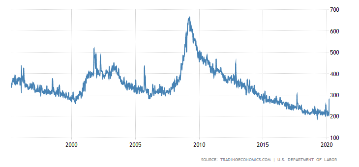 Obserwujemy pierwszy wpływ koronawirusa na rynek pracy w USA. Wstępne wnioski o zasiłek dla bezrobotnych wypadają na poziomie 281 tys. przy oczekiwaniu 220 tys. oraz przy poprzednim poziomie 211 tys. Jest to jednak relatywnie niski wzrost, biorąc pod uwagę zamykanie amerykańskiej gospodarki. Wczoraj duże koncerny samochodowe w USA podjęły decyzję o wstrzymaniu produkcji. Warto zauważyć, że był to największy tygodniowy przyrost od 2017 roku. Widać, że podczas ostatniego kryzysu finansowego wnioski rosły przez wiele miesięcy zanim osiągnęły punkt kulminacyjny. Czy tak będzie również tym razem?