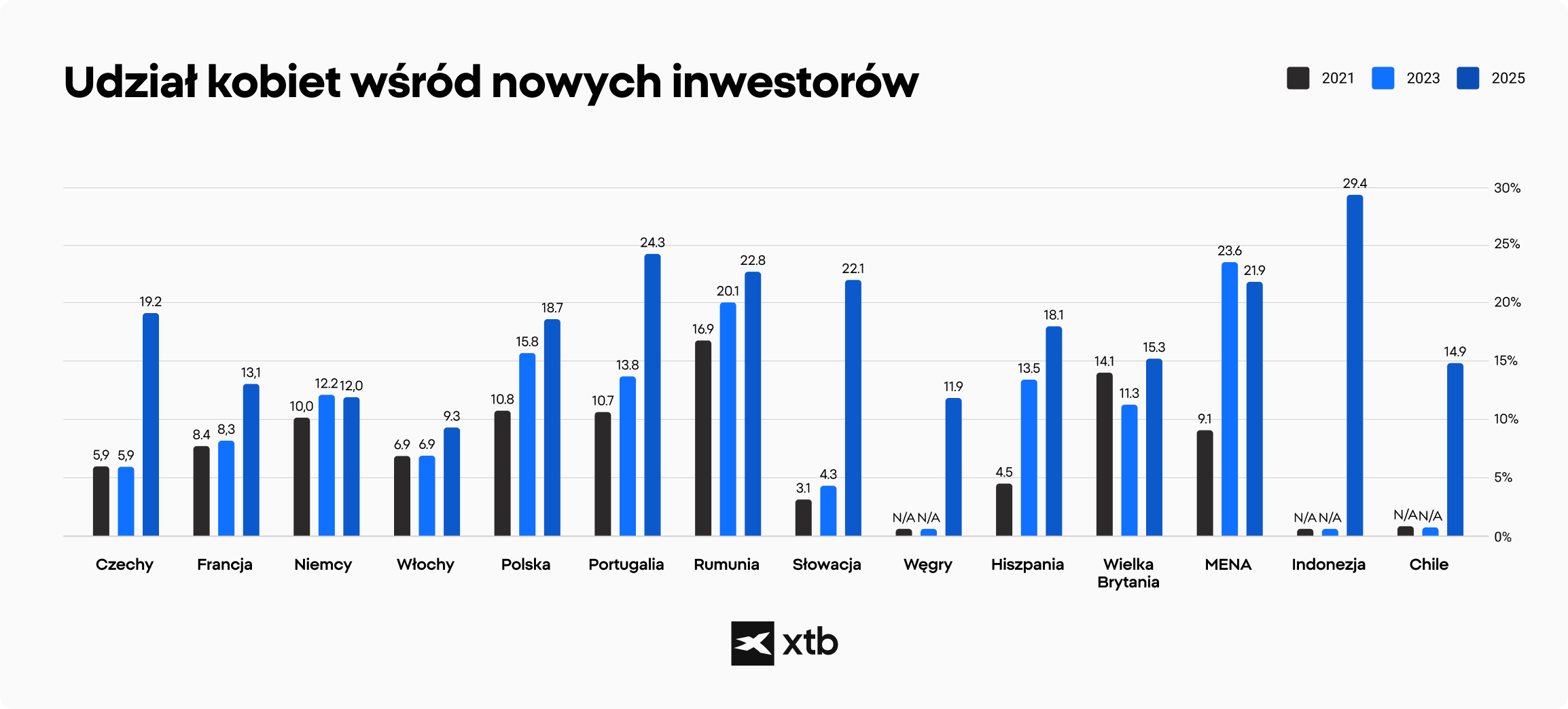Rośnie także udział kobiet wśród nowych inwestorów w Polsce i w 2025 roku stanowił on także niemal 19%. W Europie najwyższy udział nowych inwestorek odnotowano w Czechach (19,20%), Portugalii (24,30%), Rumunii (22,80%), Słowacji (22,10%) oraz Hiszpanii (18,10%).