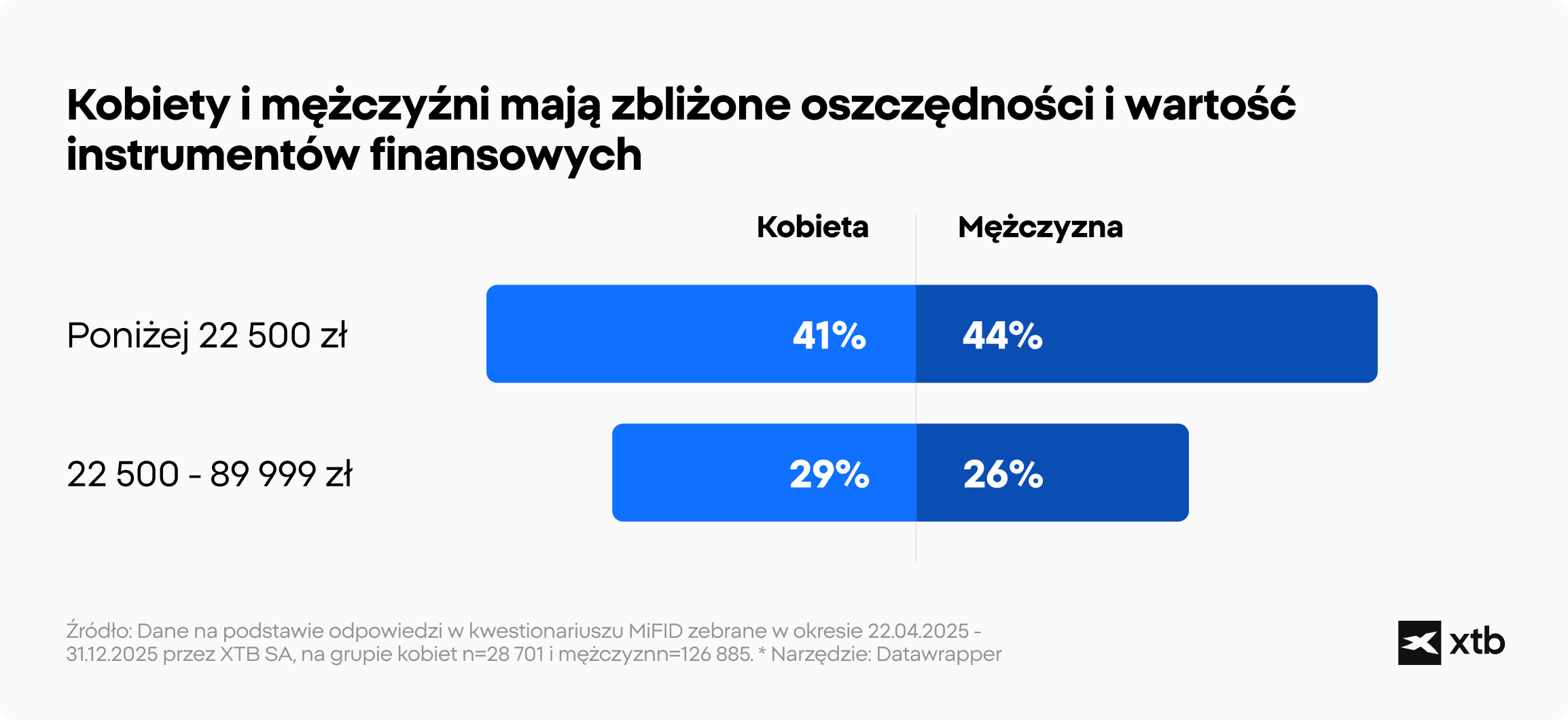 Co istotne, poziom kapitału i wartość instrumentów finansowych kobiet i mężczyzn są bardzo zbliżone. Największa grupa (41% klientek i 44% klientów) posiada oszczędności poniżej 22 500 zł, w przedziale 22 500–89 999 zł znajduje się 29% klientek i 26% klientów.