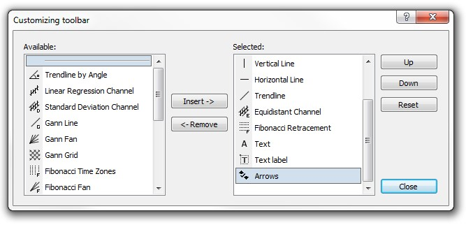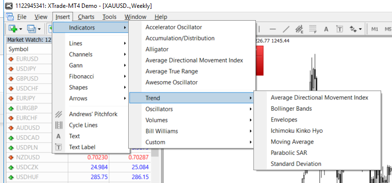 Wszystkie narzędzia niezbędne w analizie technicznej są zgrupowane w górnym menu MT4, „wstaw”.