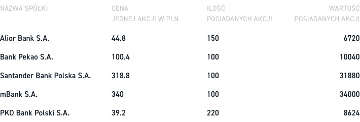 Rozważmy ostatni przykład, tym razem na rynku polskim, gdzie inwestor posiada portfel o wartości około 91 tysięcy PLN składający się z akcji banków notowanych na indeksie WIG20: