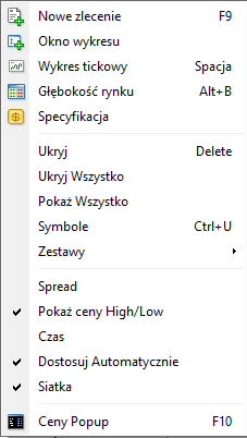 Warto wspomnieć o kilku dodatkowych funkcjach, takich jak: głębokość rynku, wykres tickowy, dodawanie swoich ulubionych instrumentów czy tworzenie zestawów oraz wiele innych – wszystkie dostępne są z menu podręcznego.