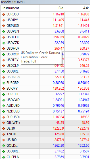 Jak widzisz, każdy dostępny instrument ma swój własny symbol – jeśli nie jesteś pewien co oznacza dany symbol, przesuń kursor myszy na ten instrument w celu uzyskania dodatkowych informacji.