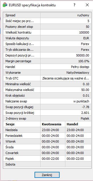 Jeżeli szukasz jeszcze więcej informacji, takich jak wielkość zlecenia/kontraktu lub godziny handlu, kliknij prawym klawiszem myszy na instrument i wybierz ‘Specyfikacja’.