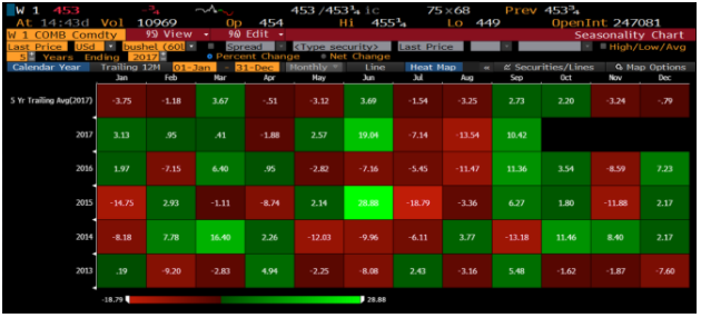 Spójrzmy na konkretny przykład. Koniec stycznia to zazwyczaj rajd byków na ziarna takie jak kukurydza czy soja. W przypadku soi, rajd sezonowy wydłuża się zazwyczaj do czasu wczesnych miesięcy letnich. Z drugiej strony, kukurydza wyhamowuje zazwyczaj w marcu. Siła ziaren jest zazwyczaj rezultatem większego ryzyka związanego z wejściem na rynki, jako że nie ma pewności co do nadchodzących zbiorów. Wiele rzeczy może pójść źle w okresie sadzenia, a traderzy wiedza, że bycze nastawienie na ziarnach może być pozycją roku, jeśli sezon siania nie pójdzie zgodnie z oczekiwaniami. Na poniższym wykresie można zobaczyć zmianę cenową pszenicy każdego miesiąca w ciągu ostatnich 5 lat.