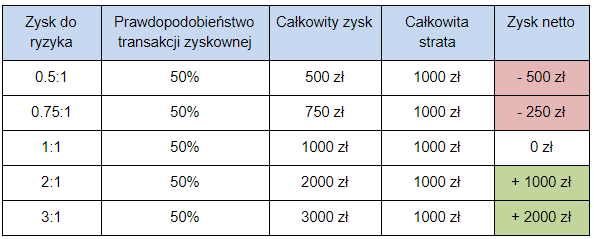 Spróbujmy zobrazować to na konkretnym przykładzie. Poniżej zamieszczono tabelę, która przedstawia różnice pomiędzy poszczególnymi współczynnikami zysku do ryzyka. Pokazany jest również ich wpływ na całkowity zysk lub stratę. W tabeli założono, że cyfra 1 (jako wartość transakcji) jest równa 100 zł, skuteczność transakcji to 50 %, a liczba transakcji wynosi 10.