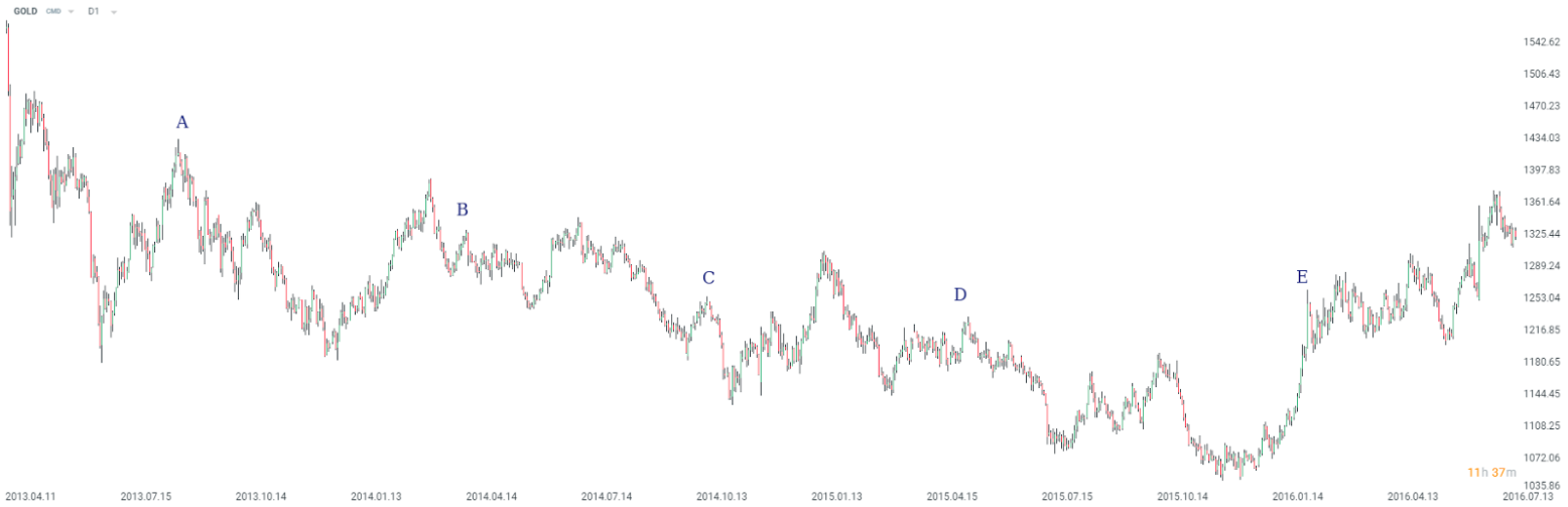 Gdy poznaliśmy już zalety i wady skalowania, przyjrzyjmy się jak strategia ta sprawdza się w praktyce. Rzućmy okiem na dzienny wykres notowań złota i wyobraźmy sobie, że inwestor zdecydował się otworzyć dwa loty po cenie 1450 (A). Rynek przesuwał się w oczekiwanym kierunku, zdecydował się więc wykorzystać korektę spadkową do dołożenia pozycji (B). Następnie ruch spadkowy wzmocnił się, więc dodał trzecią część transakcji (C oraz D). Początkowa ekspozycja wynosiła 2 loty, jednak pod koniec była czterokrotnie wyższa.