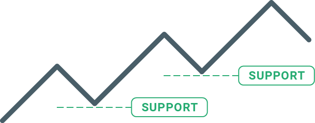 Wsparcie oznacza konkretny poziom, znajdujący się poniżej obecnej ceny, który może zatrzymać trwający ruch spadkowy. Oznacza to, że jeśli spadki dotrą w jego okolice, to bardziej prawdopodobne stanie się odbicie i wzrost niż kontynuacja wcześniejszego ruchu. Jeśli zauważysz, że rynek ma trudności z przekroczeniem określonego poziomu, to gratulacje - właśnie zidentyfikowałeś wsparcie. Ogólną zasadą jest, że poziomy wsparcia ograniczają ruch spadkowy. Stąd też wynika ich nazwa - “wspierają” cenę oraz kupujących. Skąd jednak biorą się te poziomy? Z kilku różnych powodów: mogą być to wcześniejsze szczyty lub dołki, może być to okrągły poziom cenowy czy też może być nim linia trendu (tak jak na poniższym obrazku).