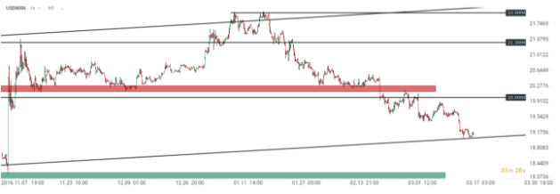 Musisz także zapamiętać, że wybity opór często staje się wsparciem, a wybite wsparcie często staje się oporem. Wyjaśnijmy to na następującym przykładzie: spójrz na parę USDMXN. Kurs w wysokości 20,00 był kluczowym poziomem, na który patrzyło wielu traderów. Po jego wybiciu nastąpił szybki ruch o 2 duże figury. Potem para zawróciła, a trend zmienił się na spadkowy. Wybity został poziom 20.00, przetestowano go ponownie od dołu, ale atak kupujących okazał się nieudany. Wsparcie zamieniło się więc w opór. Jest to typowa sytuacja w przypadku, gdy rynek porusza się w ramach trendu. Jest ona o tyle istotna, iż stwarza wiele możliwości na dołączenie trwającego ruchu, co jest jedną z najpopularniejszych strategii tradingowych. W tym przypadku, mógłbyś sprzedać parę po ponownym przetestowaniu 20,00, czekając na kontynuację ruchu spadkowego.