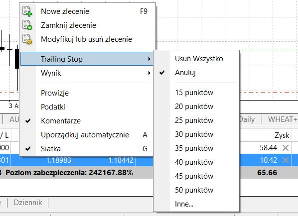 Aby ustawić Trailing stop, kliknij prawym przyciskiem myszy na otwartej pozycji w oknie "Terminal" i podaj pożądaną odległość wyrażonej w punktach pomiędzy poziomem Trailing Stop a bieżącą ceną rynkową.
