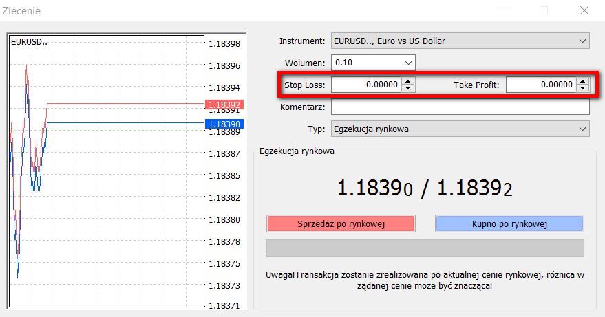 Pierwszym i najprostszym sposobem, aby dodać Stop Loss lub Take Profit do Twojej transakcji, jest ustawienie ich od razu przy składaniu nowego zlecenia (Okno zlecenia).
